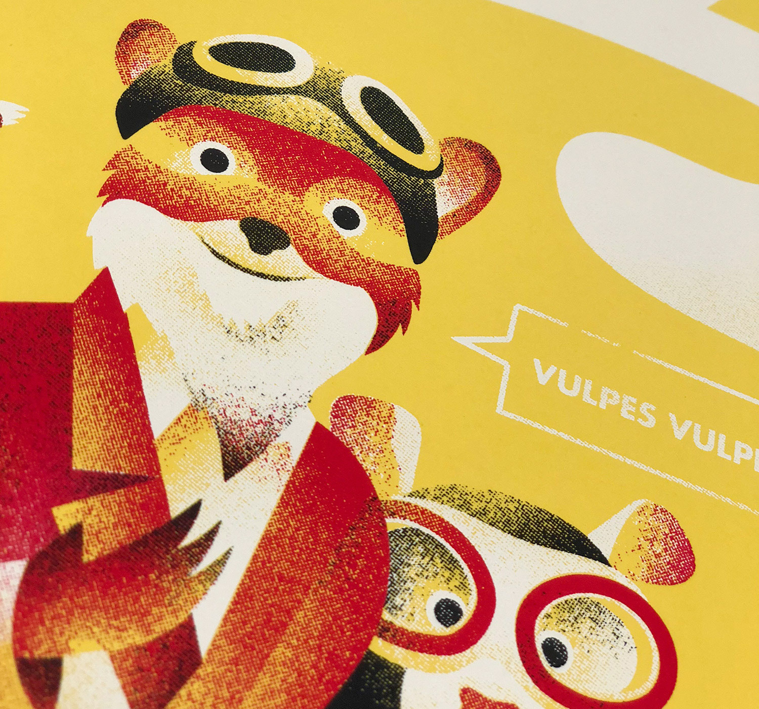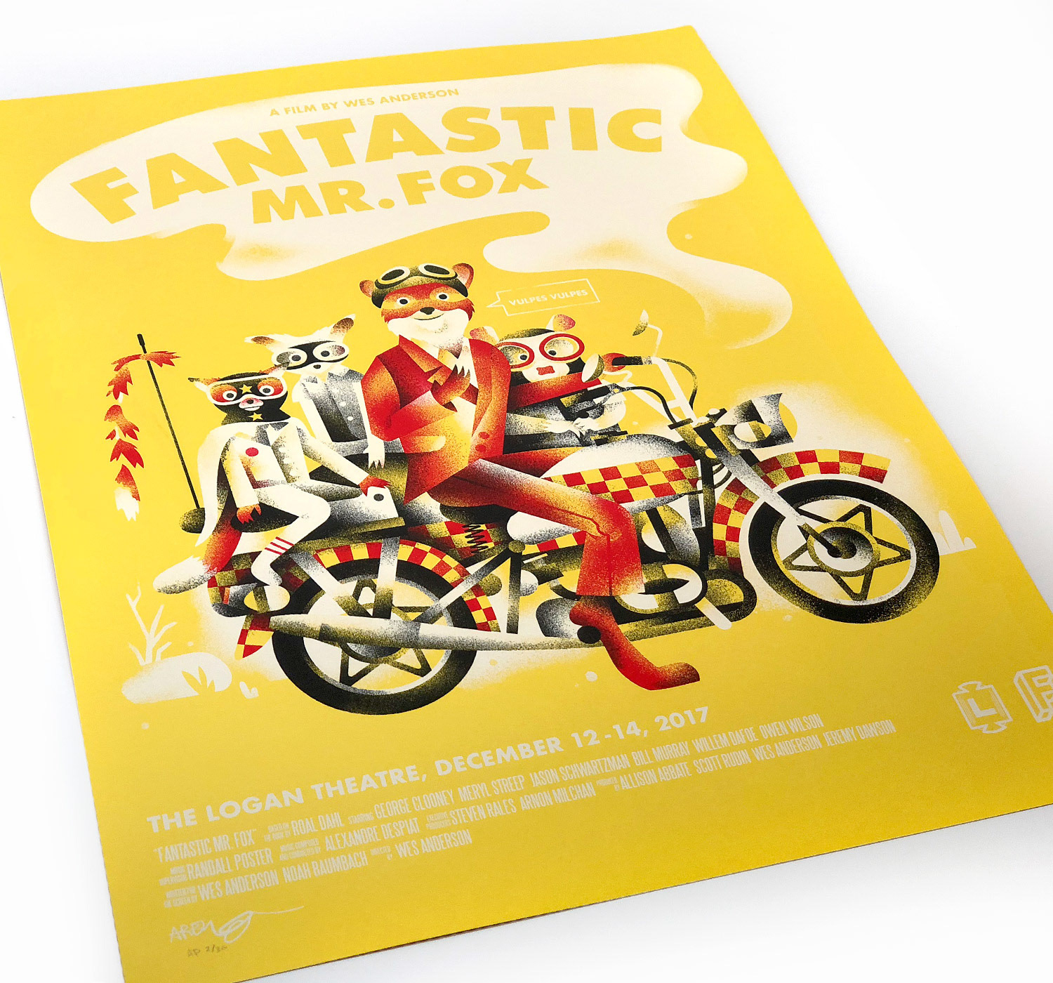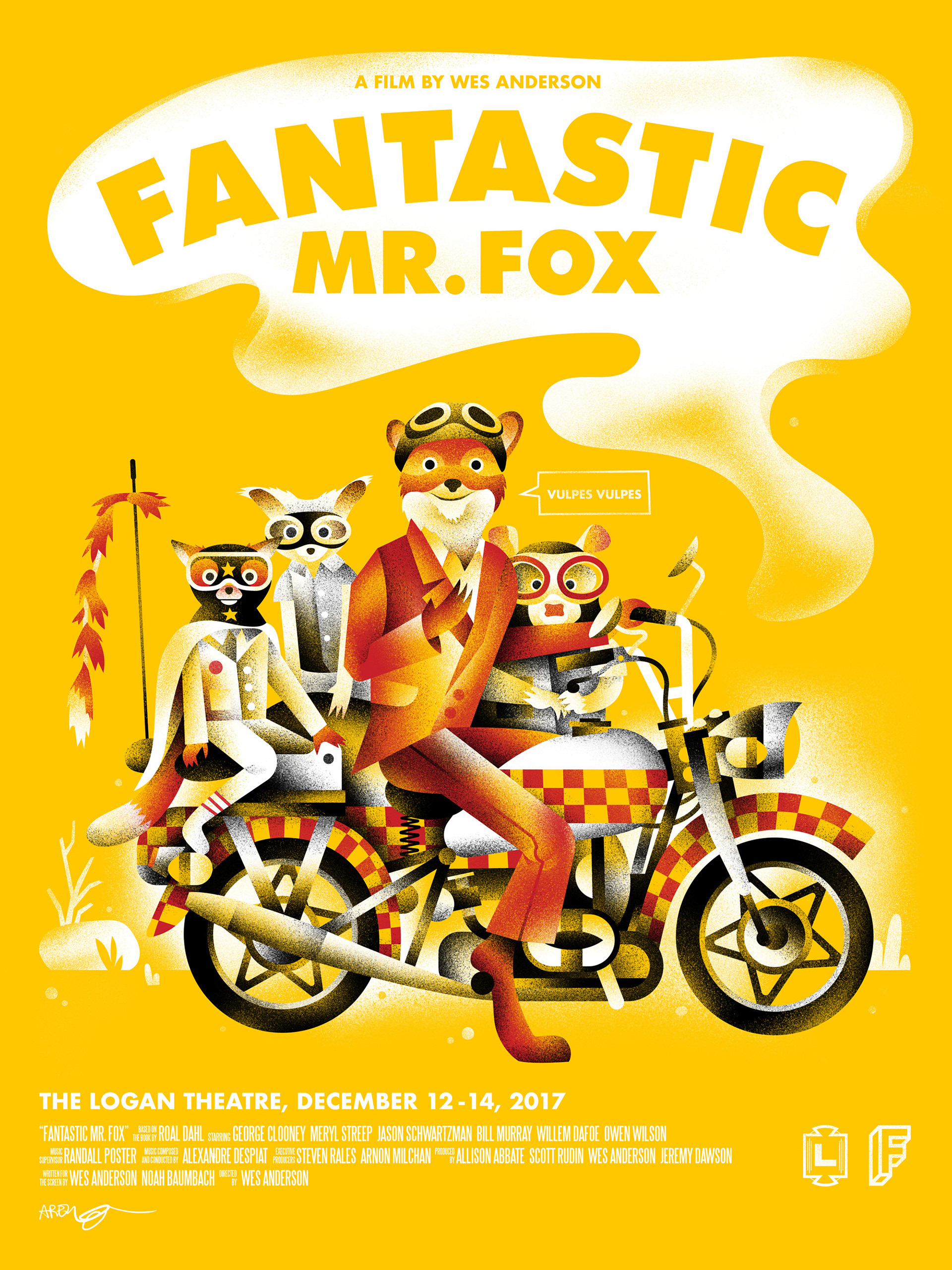Movie poster commissioned by Galerie F in Chicago, for the Logan Theatre's December 2017 screenings of Wes Anderson's Fantastic Mr. Fox.