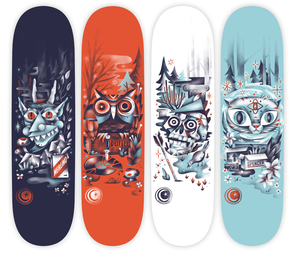 A suite of 4-color illustrations created for a series of Foundations pro model skateboard decks. Additionally a couple of t-shirt graphics were created to accompany the boards.