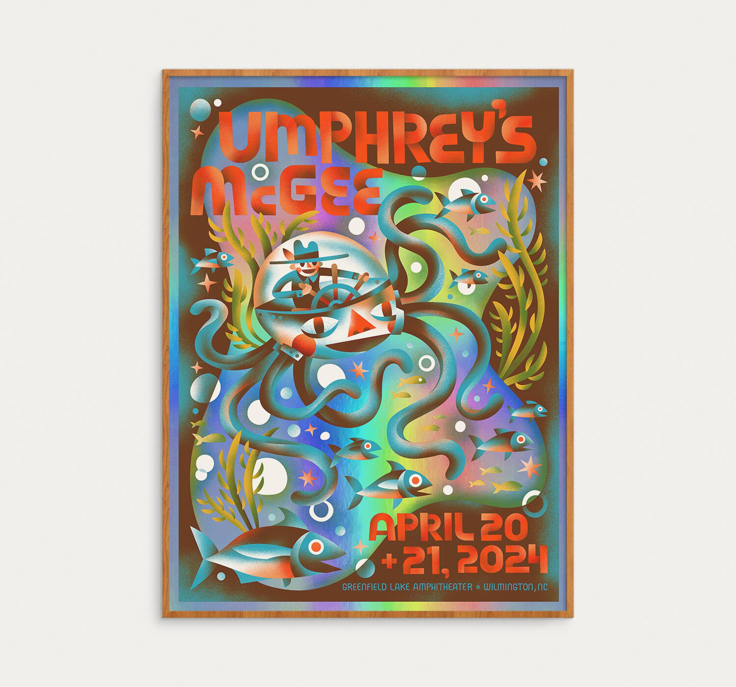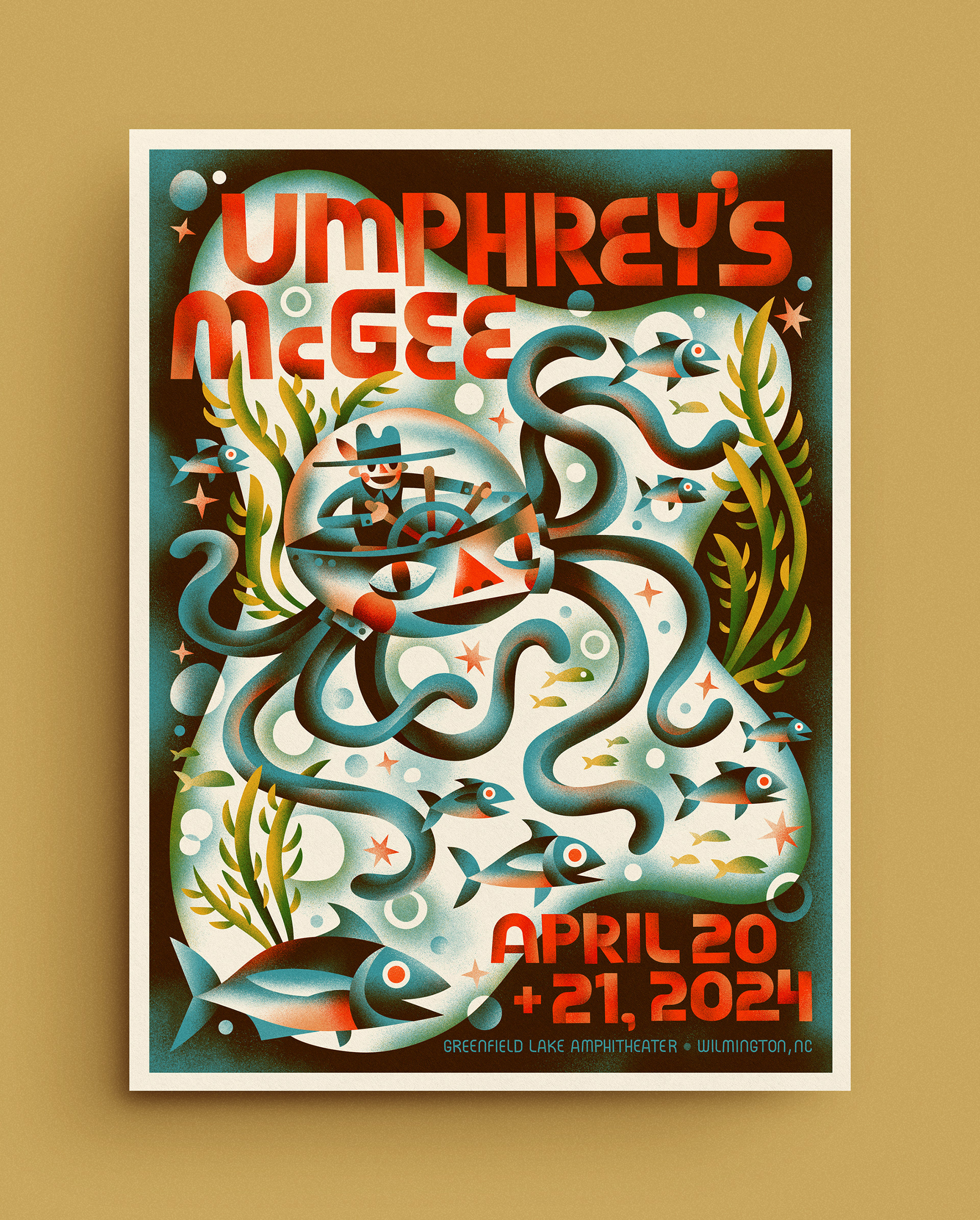 The official poster for Umphrey's McGee's April 20 & 21, 2024 shows at The Greenfield Lake Amphitheater in Wilmington, North Carolina.